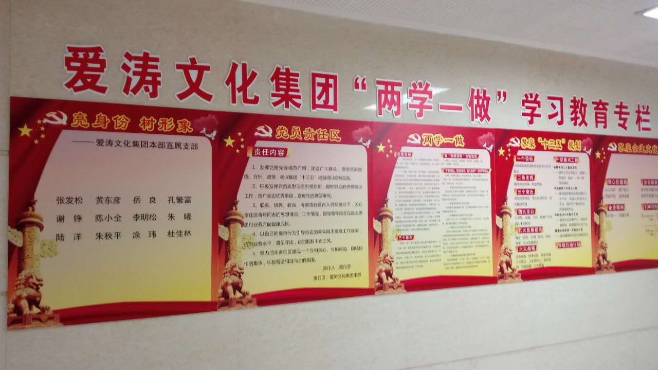 愛濤文化集團各支部分散在不同的工作地點,為增強“兩學一做”學習教育效果,將學習教育的內容普及到全體黨員,各支部在不同的工作地點分別設立了《‘兩學一做’學習教育專欄》,并張貼在辦公區醒目的位置。宣傳欄內容包括:“兩學一做”學習要點;亮身份,樹形象,公示支部黨員名單;黨員責任區職責;蘇豪控股“十三五”規劃;蘇豪控股企業文化等。同時,各支部還設立黨員示范崗、黨員責任區,充分發揮共產黨員的先鋒模范作用,增強廣大黨員的黨員意識、責任意識和服務意識。